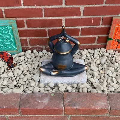 Want to add a little zen to your patio or garden decor? This adorable garden statue features a cute frog in his yoga position becoming one with nature. Features his arms and hands up in prayer. This will make a great addition to your backyard, front yard, garden, porch or to add a little fun to your indoor space.Product Features:Yoga frog outdoor garden statueFeatures frog sitting in a yoga prayer positionStatue is dark gray with gold colored accentsPerfect for patio or gardenRecommended for outdoor useDimensions: 8.75″H x 12″W x 5″DMaterial(s): polyresin