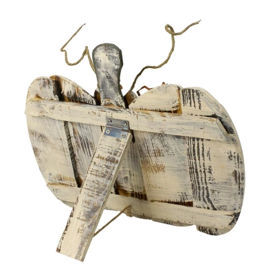 Add a touch of farmhouse chic to your Thanksgiving or Autumn decor with this rustic wooden pumpkin. Features painted carved wood that’s been perfectly distressed to take on a vintage feel. A green stem and leaves on vines complete the piece. Perfect on your holiday table or mantle.Features:Wood pumpkin Thanksgiving decorationCarved and distressed finishComplete with stem and leavesEasel style stand allows to sit on any flat surfaceDimensions: 13.5″H x 15″W x 1.5″DMaterial(s): wood/wire