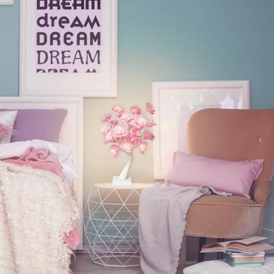 Elegant pink rose flower tree is charming and natural. It emits a warm romantic glow perfect for weddings, Valentine’s Day, Sweetest Day, or anniversary celebrations! Soft delicate pink roses are illuminated from the inside by warm white micro LED lights and sit upon white hand-wrapped branches. This tabletop tree is just as stunning with the lights off! Pairs beautifully with our matching rose flower string lights. Product features:Pre-lit with 24 lightsBulb color: warm whiteBulb size: micro wide angle Bulb type: LEDHand-wrapped branches and trunk Branches are bendable to help accommodate your decorating needsIncludes an attached white tree standFor indoor use onlyRequires (3) ‘AA’ size batteries – not includedConvenient on/off switch on the bottomNon-replaceable bulbsDimensions: 17″H x 14″W x 12″DStand: 1″H x 4″W x 4″DMaterial(s): metal/plastic/wire