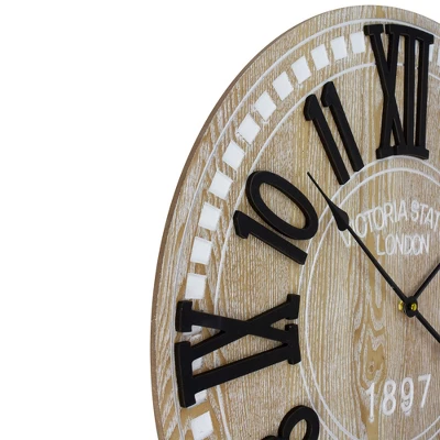 This unique clock is designed with roman numeral and block numbers. A great wall piece for an industrial decor design. You don’t have to worry about electric cords since it is battery-operated.Product Features:Round wall clock with a whitewash backgroundFeatures large black block numbersRoman numeral nmbers represent the 12, 3, 6 and 9Black hour and minute handsRequires (1) AA battery, not includedRecommended for indoor or outdoor useDimensions:24″H x 24″W x 1.5″DMaterial(s): wood/plastic/metal