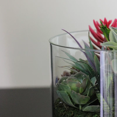 Zest your favorite places with this elegantly designed succulent plan in round glass jar to elevate your home decor. This lively accessory is a must buy element for a refreshing setup. This irreplaceable plant decorative is available to suit your needs and match your decor.Product Features:Extremely realistic plants are nestled in a large, clear glass jarPlants are set in faux moss that adds to the natural lookDeep greens, pinks, and purples bring life to any decorDimensions: 5″ high x 8″ diameterMaterial(s): glass/foam/plastic